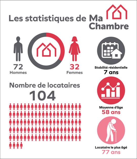 Actuellement, 104 personnes habitent dans les immeubles appartenant à l’organisme. Sur celles-là, 72 sont des hommes et 32 sont des femmes. Les locataires sont âgés en moyenne de 58 ans et habitent au sein de l’organisme depuis environ sept ans. Le locataire le plus âgé a 77 ans. Il est très intéressant de constater que les locataires présentent cette belle stabilité résidentielle. Il est à noter que celle-ci est particulièrement importante pour ceux habitant au sein de l’immeuble où se trouve la principale salle communautaire dans laquelle se déroulent de nombreuses activités pour eux. Ce lien entre le soutien communautaire et la pérennité en habitation semble indéniable puisque celle-ci passe à 15 ans à cet endroit, soit quatre ans et demi de plus que la moyenne. On peut donc affirmer que ce soutien fait une véritable différence pour les locataires.